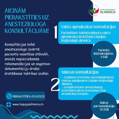 Liepājas Reģionālajā slimnīcā anesteziologa konsultācijas apmaksa ir atkarīga no tā, vai turpmākā ārstēšana vai plānotā manipulācija ir valsts apmaksāta, tiek saņemta kā maksas pakalpojums, vai arī pakalpojums paredzēts citā ārstniecības iestādē.