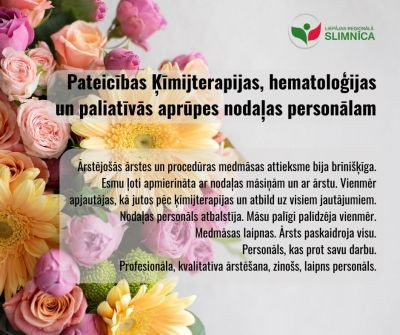 2025. gada pirmajos sešos mēnešos saņemtās pacientu atsauksmes par Liepājas Reģionālās slimnīcas Ķīmijterapijas, hematoloģijas un paliatīvās aprūpes nodaļu apliecina, ka šeit tiek nodrošināta ne vien augsta profesionālā kvalitāte, bet arī izpratne, cilvēcīga pieeja un sirsnīga attieksme. Pacienti ar lielu pateicību dalās savos iespaidos par nodaļā pavadīto laiku. Gandrīz visas atsauksmes vieno kopīgs vārds – atsaucība.