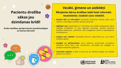 Katru gadu 17. septembrī pasaulē tiek atzīmēta Pacientu drošības diena. Pasaules Veselības organizācija par 2025. gada prioritāti ir izvirzījusi tēmu “Droša veselības aprūpe katram jaundzimušajam un katram bērnam”, lai veicinātu izpratni par drošības riskiem bērnu un jaundzimušo aprūpē visās veselības aprūpes iestādēs, uzsverot bērnu, ģimeņu un aprūpētāju īpašās vajadzības.